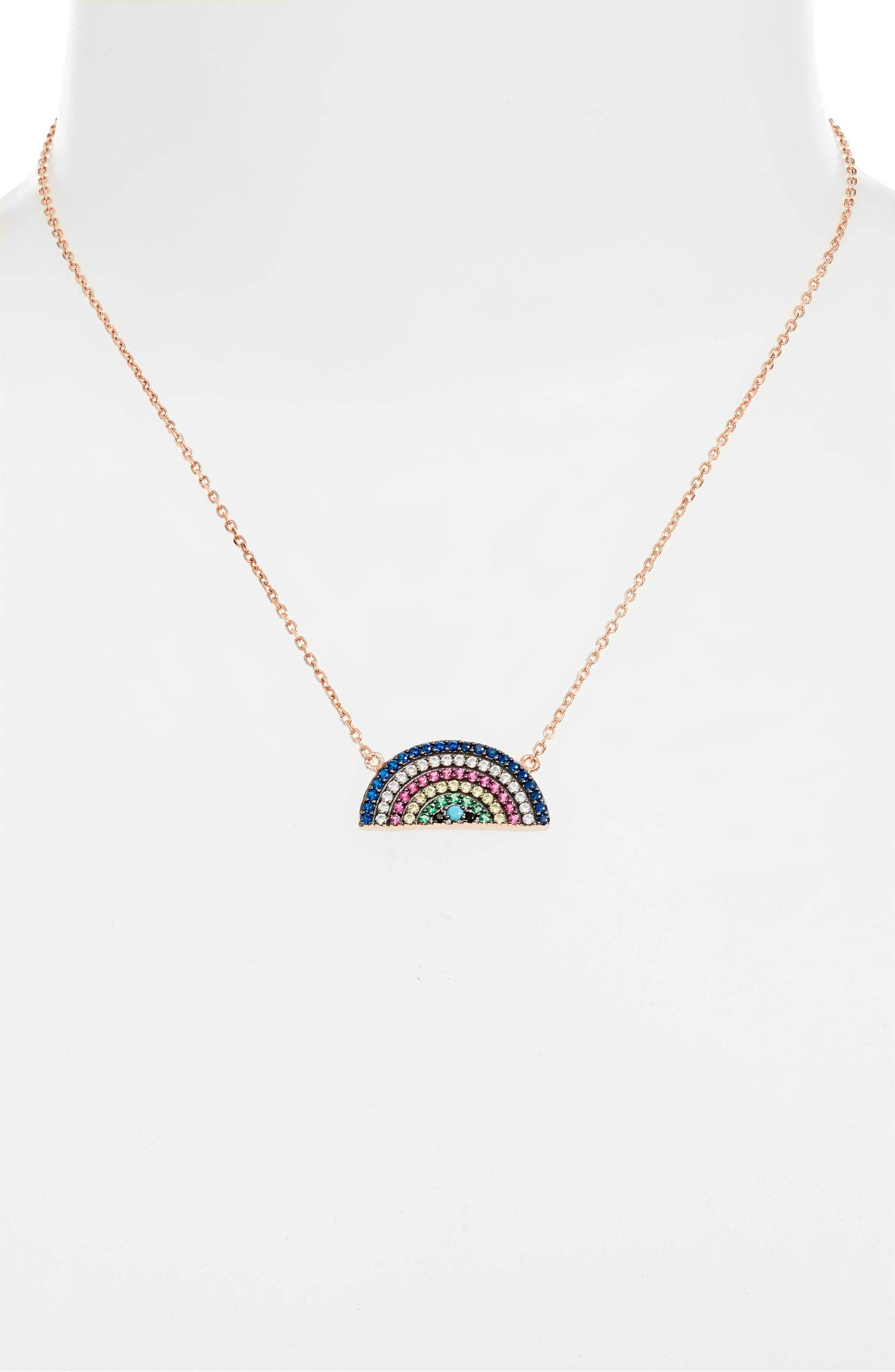 Sparkling crystals bring this whimsical rainbow charm necklace to life.